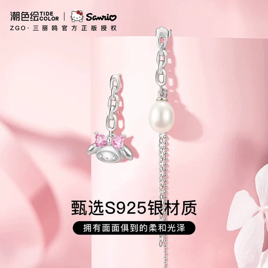 My Melody Pink Bow Pearl Tassel Asymmetrical 925 Sterling Silver Earrings