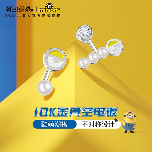 Minions Cute Eyes Asymmetrical 925 Sterling Silver Pearl Stud Earrings