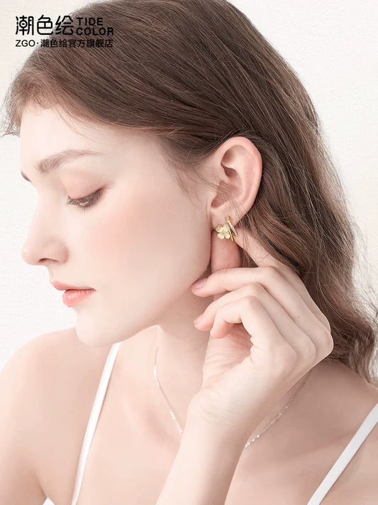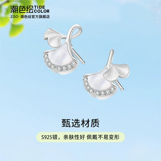 Ginkgo Leaf Pearl Shell Zircon 925 Sterling Silver Stud Earrings