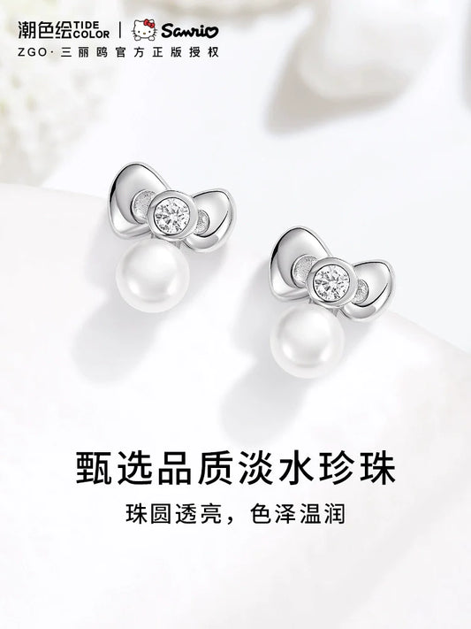 Hello Kitty Bow Pearl 925 Sterling Silver Stud Earrings