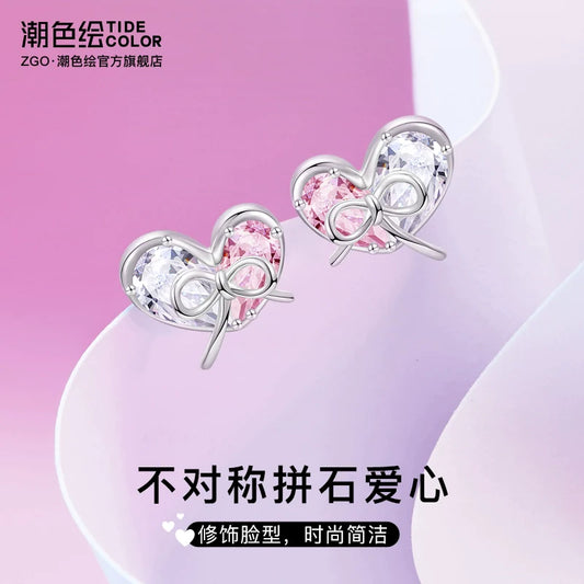 Heart Bow Zircon 925 Sterling Silver Stud Earrings