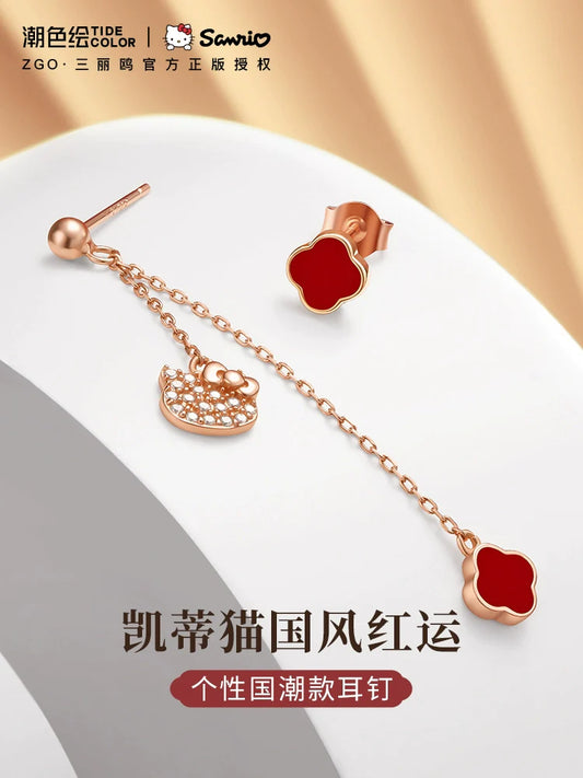 Hello Kitty Lucky Red 4-Leaf Clover Zircon Asymmetrical 925 Sterling Silver Earrings
