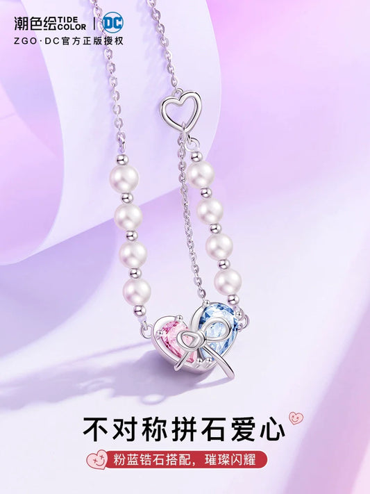 Harley Quinn Pink Blue Heart Bow 925 Sterling Silver Pearl Necklace